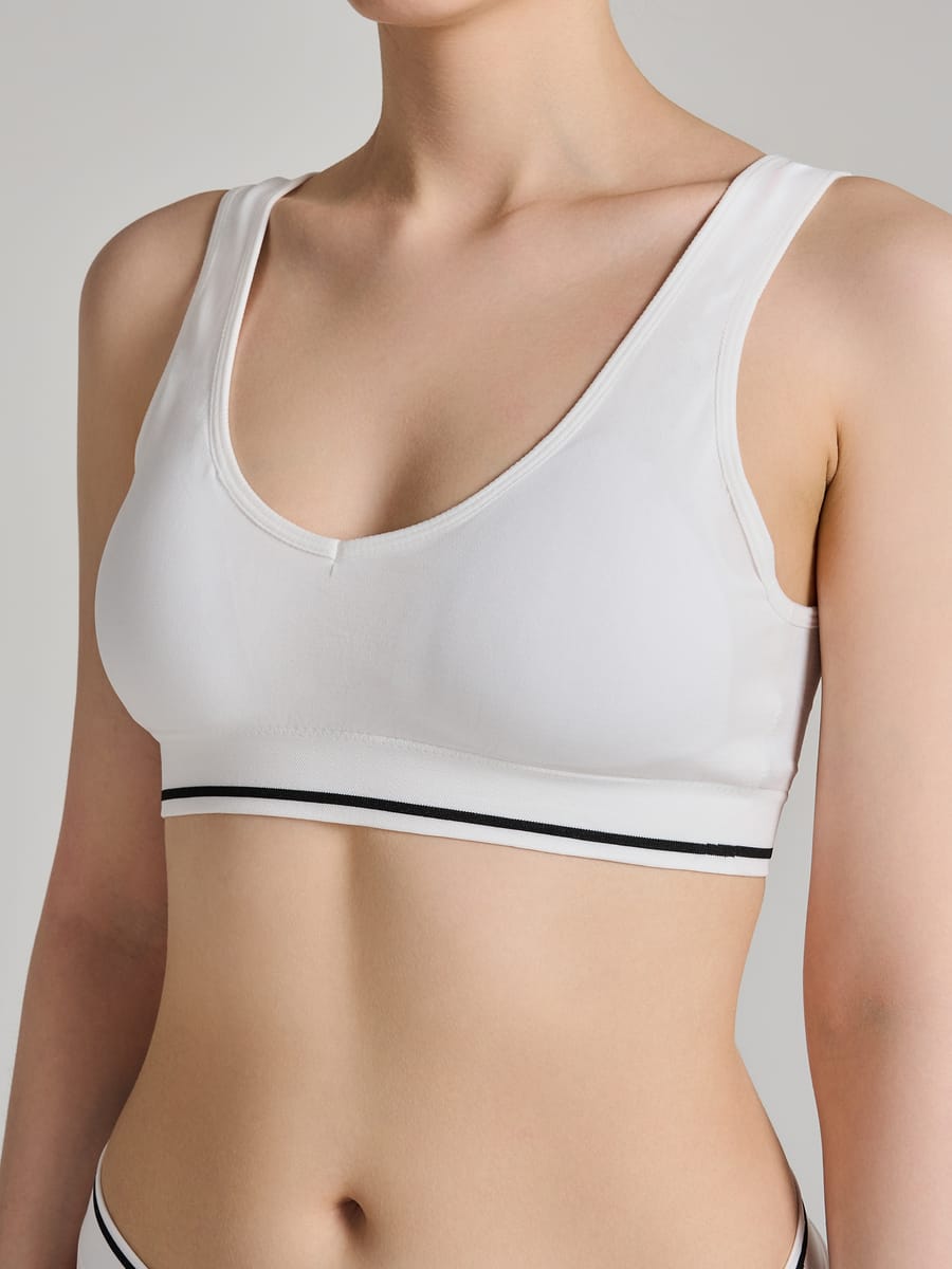 Женский бюстгальтер‑топ от бренда ТВОЕ — это воплощение комфорта и лаконичной элегантности, продуманное до мелочей для повседневного удобства. Глубокий белый цвет делает модель универсальной: она легко сочетается с любой одеждой и остаётся незаметной под облегающими вещами, при этом добавляя образу сдержанной утончённости.