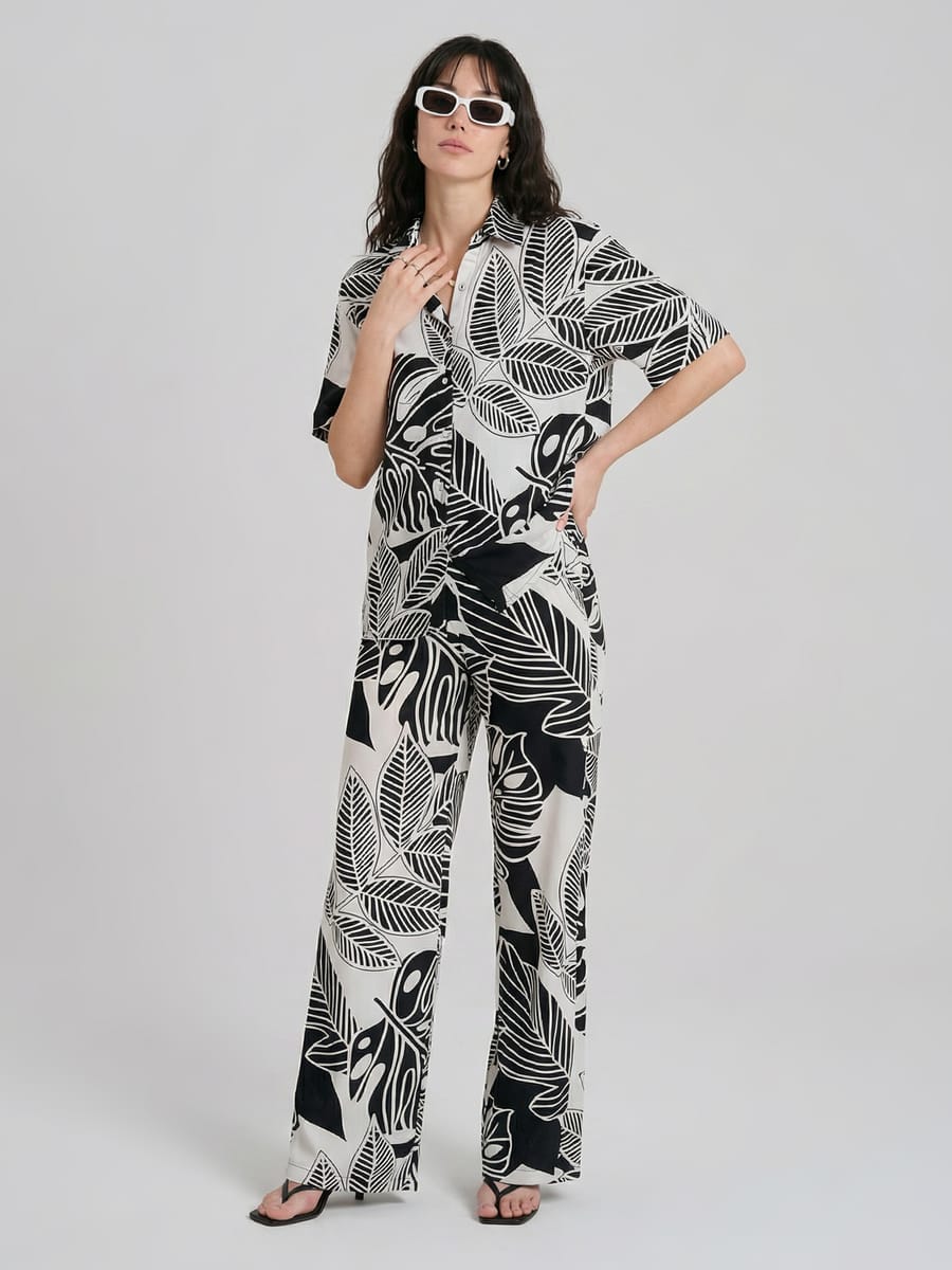 Модный брючный костюм‑двойка от ТВОЕ 2026 года — тренд сезона с изящным цветочным орнаментом. Рубашка с коротким рукавом и отложным воротником сочетается с прямыми брюками на резинке и прорезными карманами. Лёгкий и комфортный, он идеально подходит для летних повседневных и уличных образов. Отличный выбор для подростков, девушек и женщин — добавьте этот стильный костюм в свой гардероб и создайте яркие летние луки!