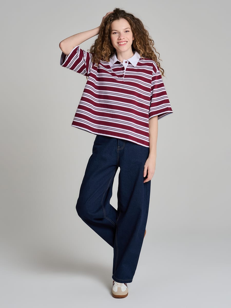 Стильное и комфортное поло от бренда ТВОЕ — универсальная вещь, которая легко впишется в повседневный, школьный или офисный гардероб. Внешний вид включает в себя бордово-белые полосы, создающие свежий, динамичный образ и оверсайз крой — модный свободный силуэт, обеспечивающий комфорт и свободу движений. Выберите поло от ТВОЕ — сочетание классического дизайна, натурального хлопка и современного кроя для вашего комфорта и стиля!