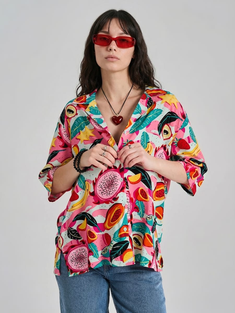 Женская рубашка от бренда ТВОЕ — стильная модель 2026 года, которая мгновенно перенесёт вас в атмосферу тропического лета. Гавайский фасон с ярким принтом экзотических фруктов заряжает позитивом и создаёт игривое настроение: сочные цвета и сочные мотивы будто напоминают о тёплых днях, море и отдыхе под пальмами.