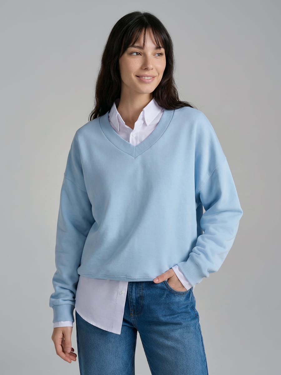 Женский свитшот от бренда ТВОЕ в благородном голубом оттенке — это образец современной базовой вещи, которая легко трансформируется под разные стилистические задачи. Однотонное исполнение придаёт модели универсальность: она органично впишется как в деловой гардероб, так и в непринуждённый повседневный образ, позволяя создавать множество выразительных комбинаций. Особенность модели — изящный V‑образный вырез, который деликатно акцентирует линию шеи, придавая силуэту утончённость и визуальную лёгкость. Прямой крой обеспечивает комфортную посадку по фигуре, не сковывая движений, а длинные рукава с манжетами добавляют изделию завершённость, сохраняя тепло в прохладную погоду. Благодаря продуманным пропорциям толстовка выглядит аккуратно и стильно, оставаясь при этом по‑настоящему удобным в ежедневной носке.